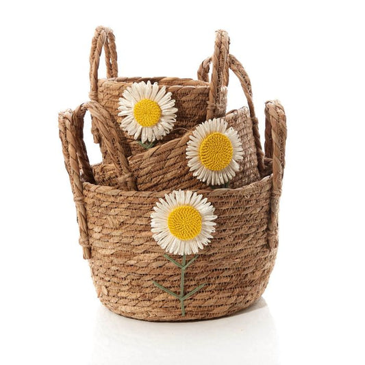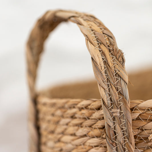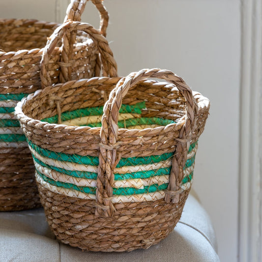 Straw And Corn Basket Green Stripe With Handles Set of 3
