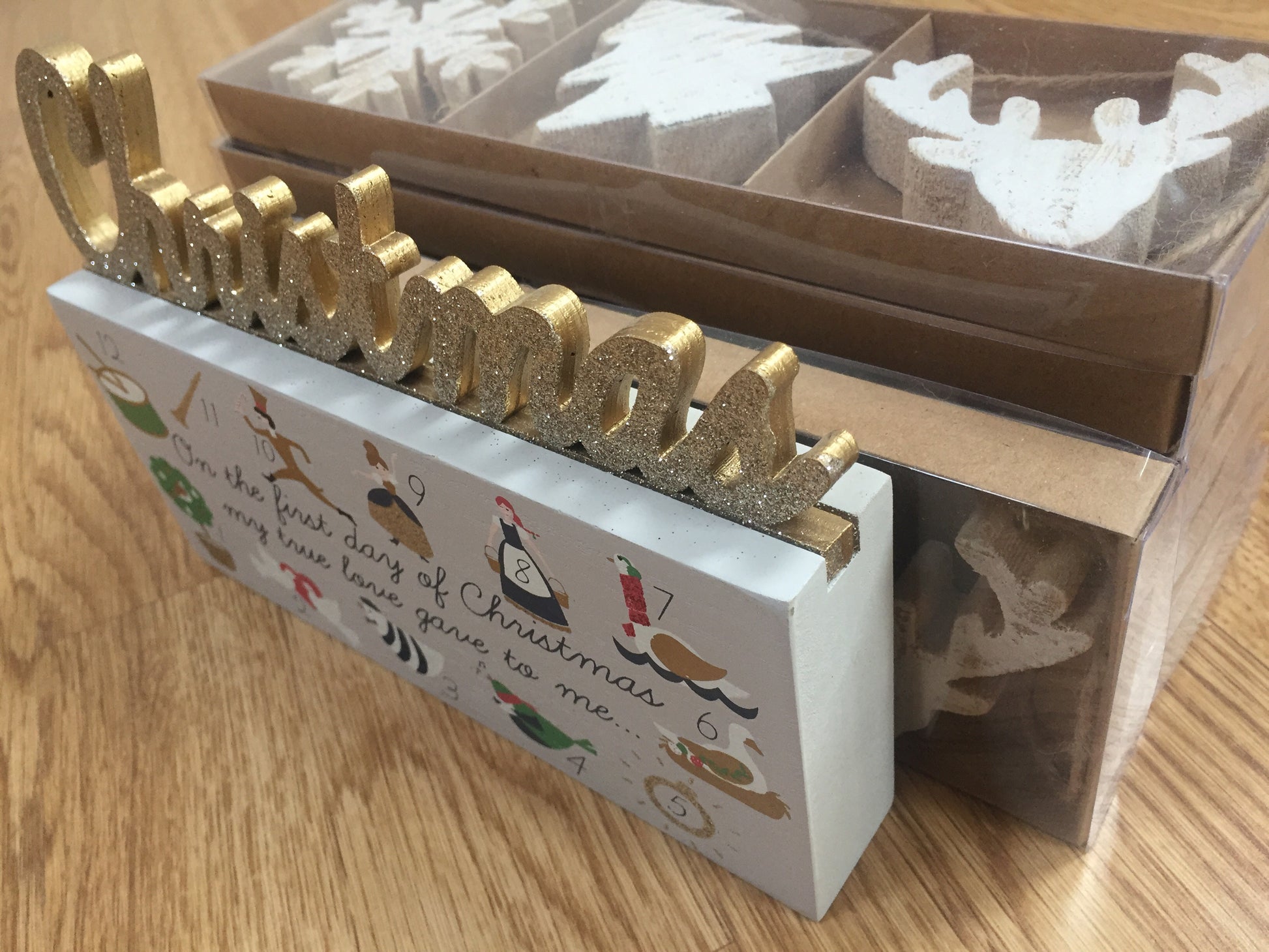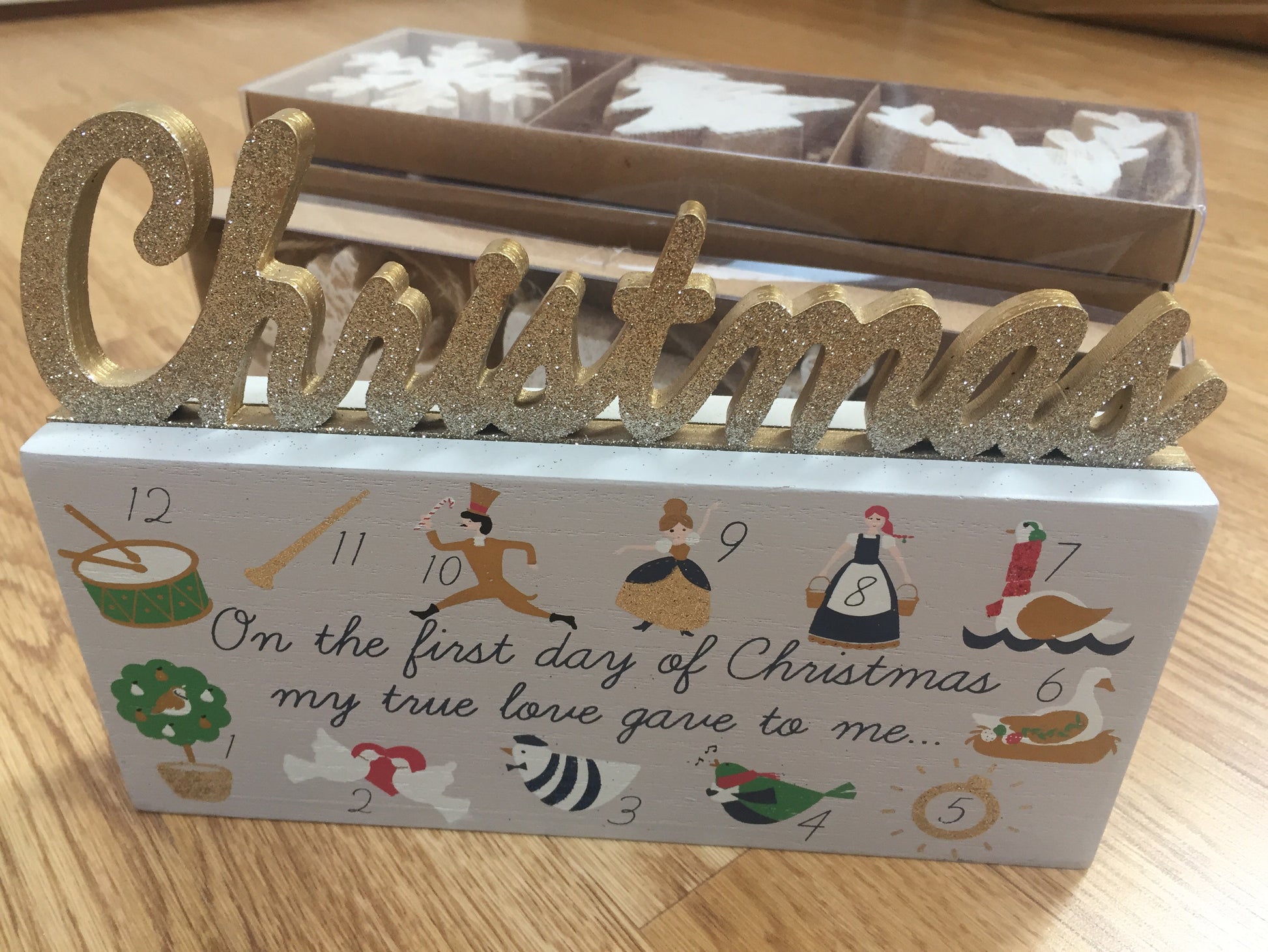 Wooden block featuring the 12 days of Christmas with gorgeous drawings & topped off with a gold glittery Christmas
