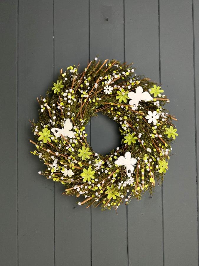 A rustic twig wreath dressed with artificial flowers and greenery, finished with 3 laser cut butterflies.