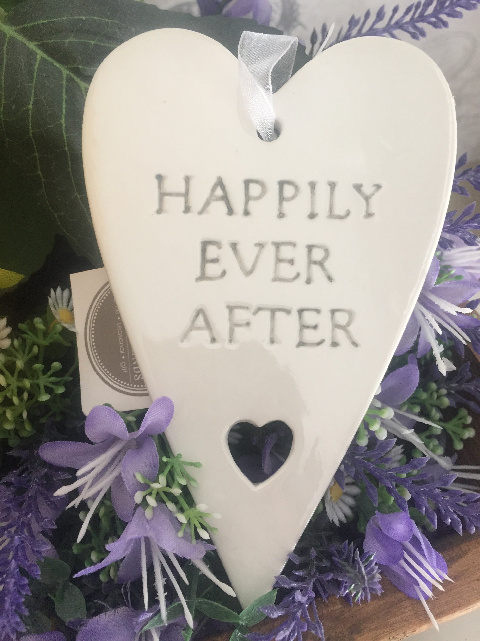 White ceramic heart with gorgeous cut out heart at the bottom and the words Happily Ever After. Comes with ribbon for the happy couple to hang in pride of place.