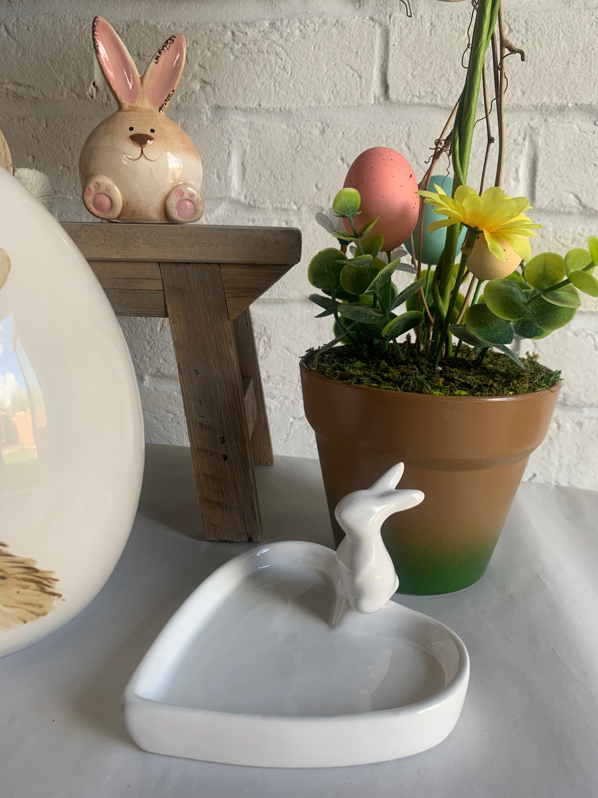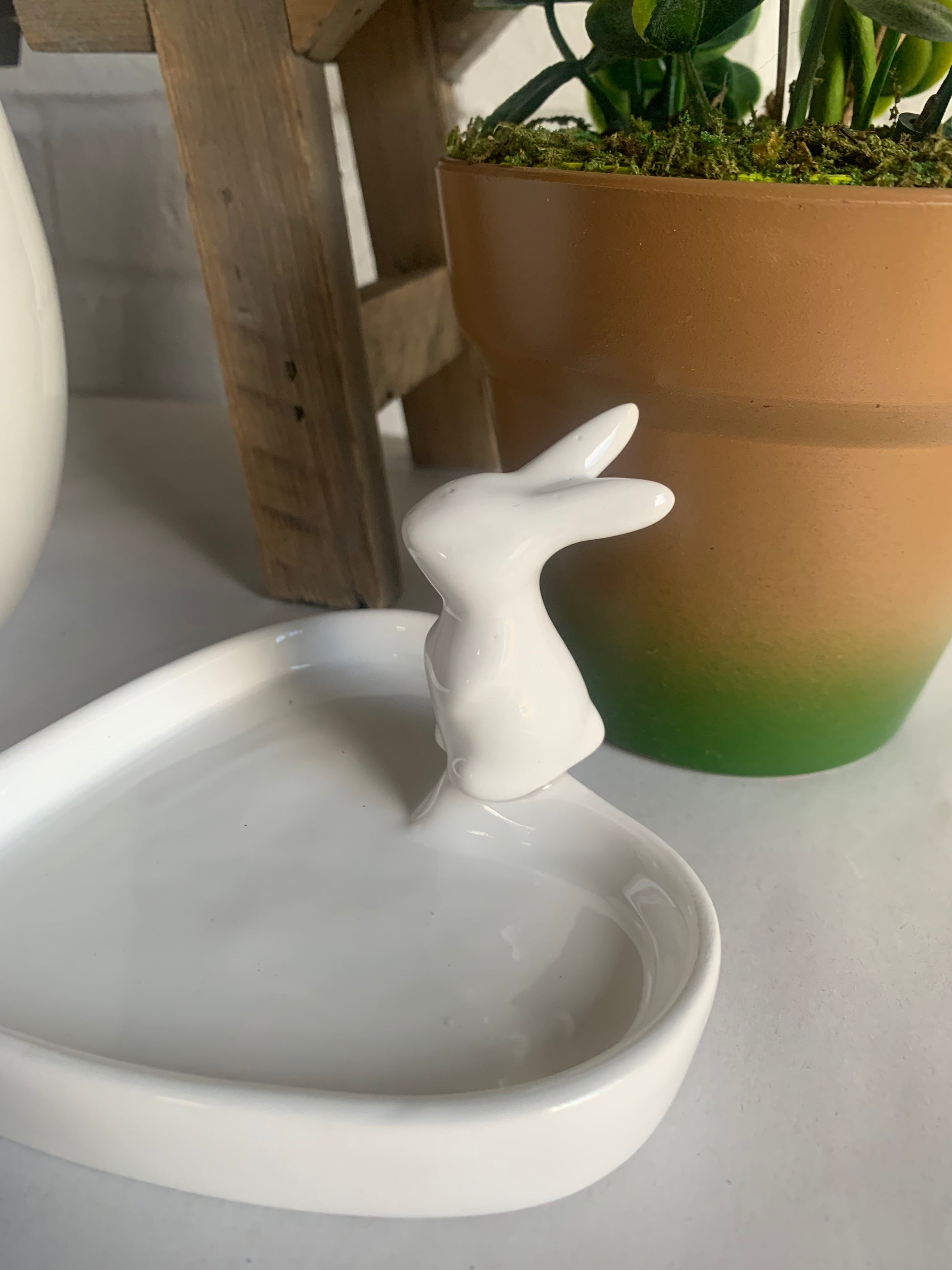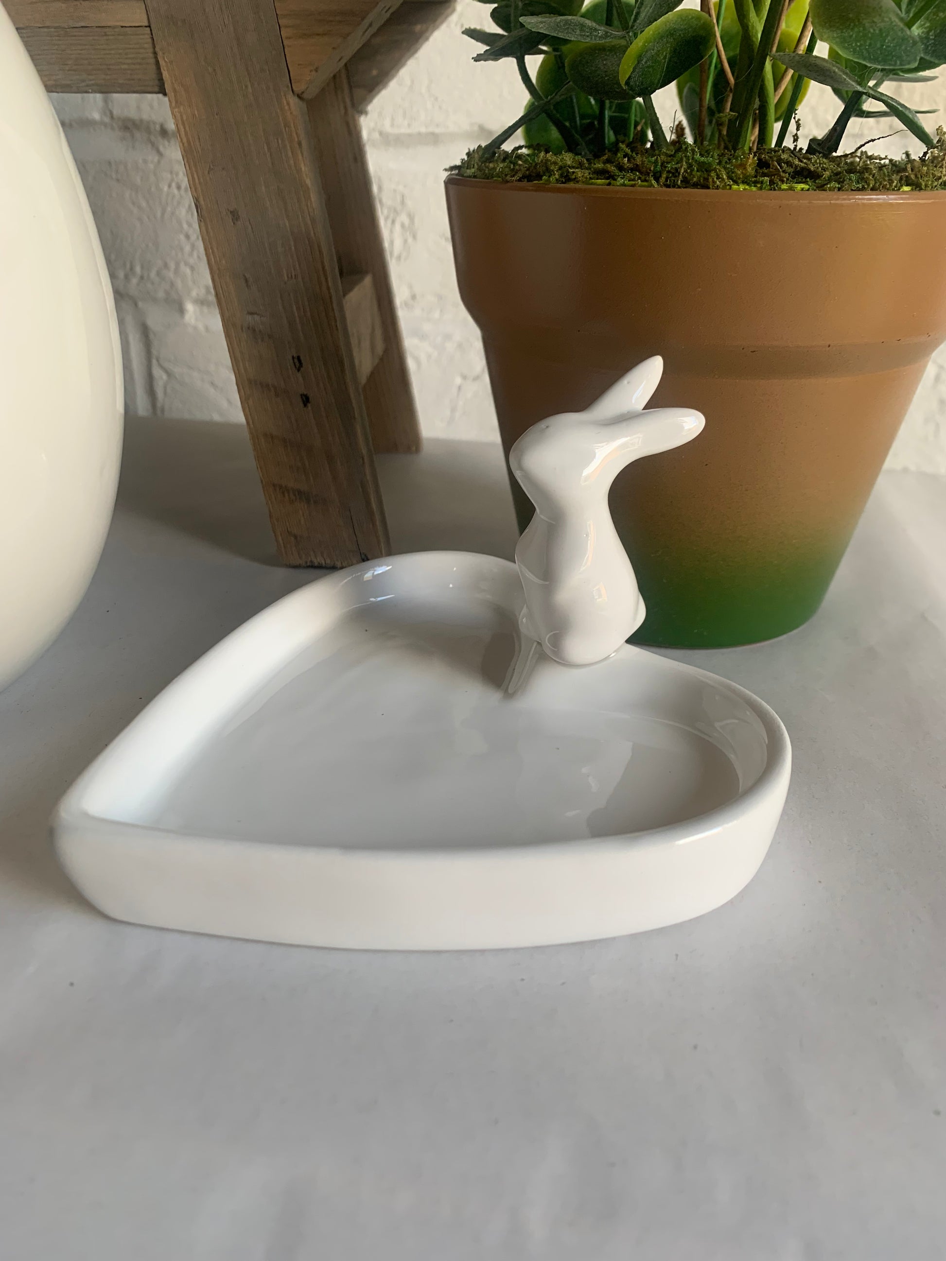 A chic heart shaped trinket dish with an adorable bunny figure.