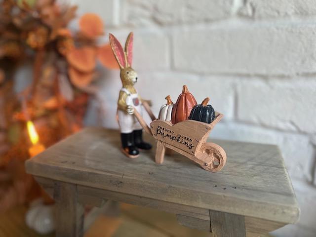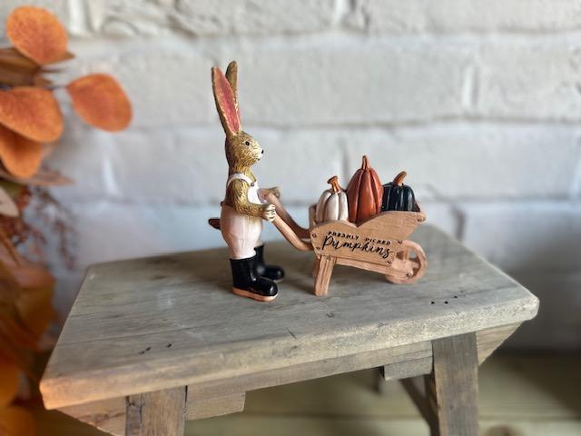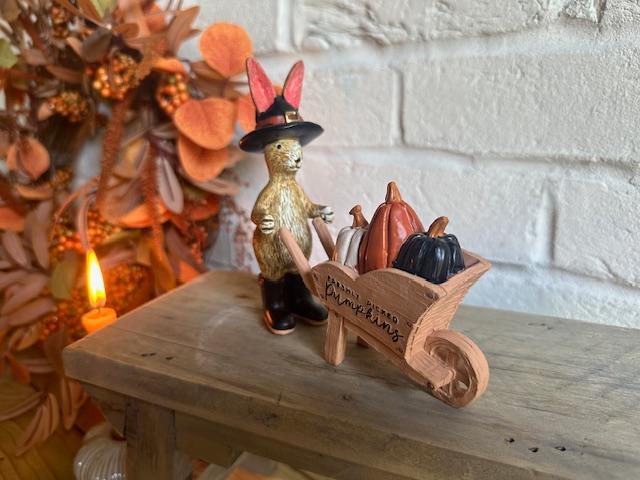 Another one of our favourite resin rabbits this time dressed for the autumn season, holding a wheelbarrow filled with pumpkins.