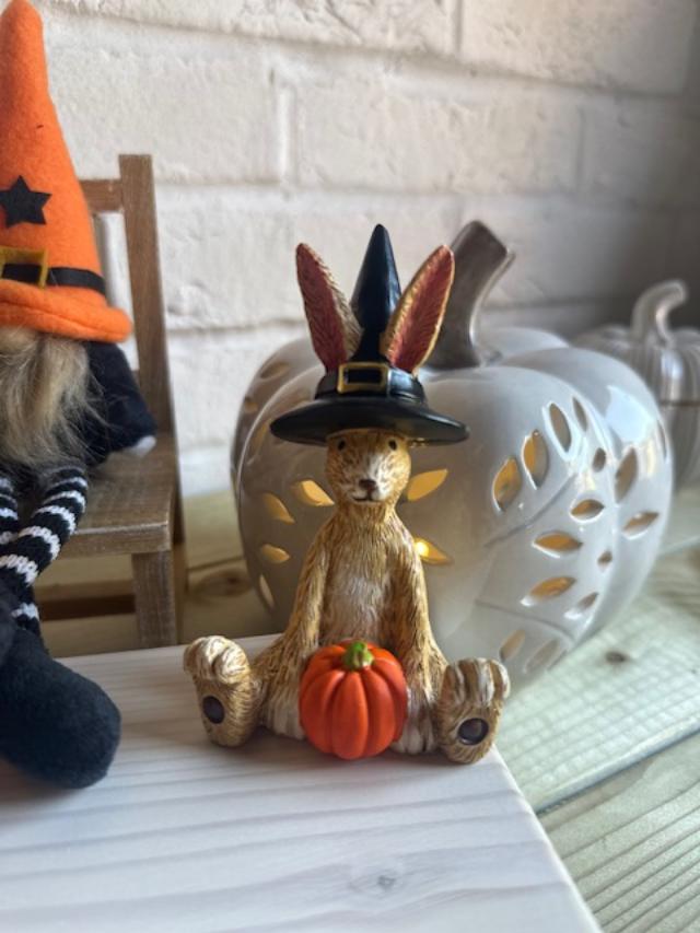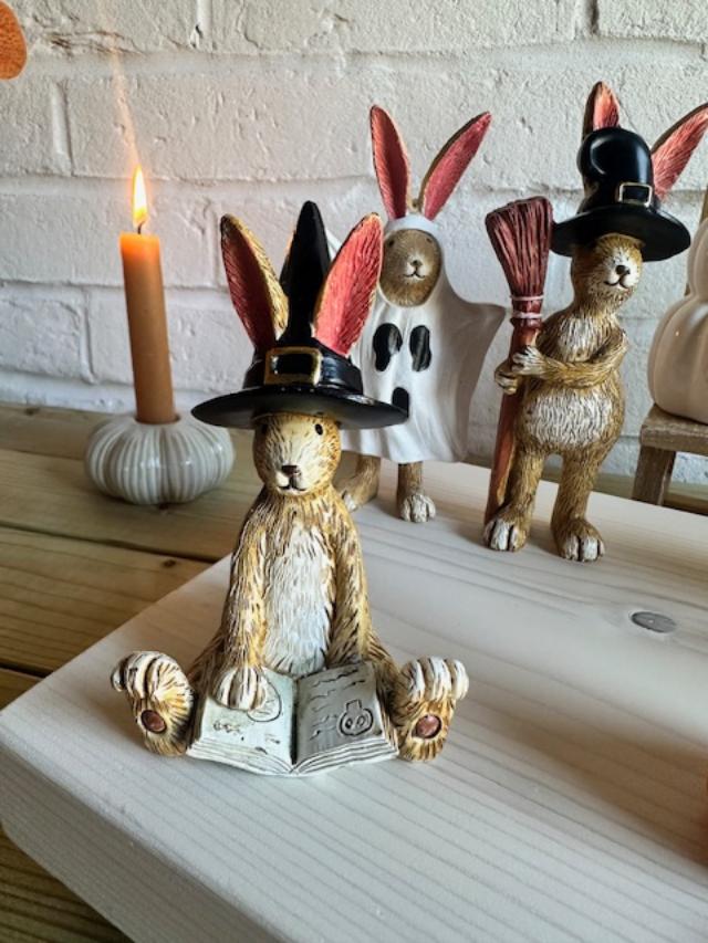 An adorable addition to our spooky bunny collection. Our witch bunnies come complete with a witches hat and either a black bow, cute pumpkin or book of spells.