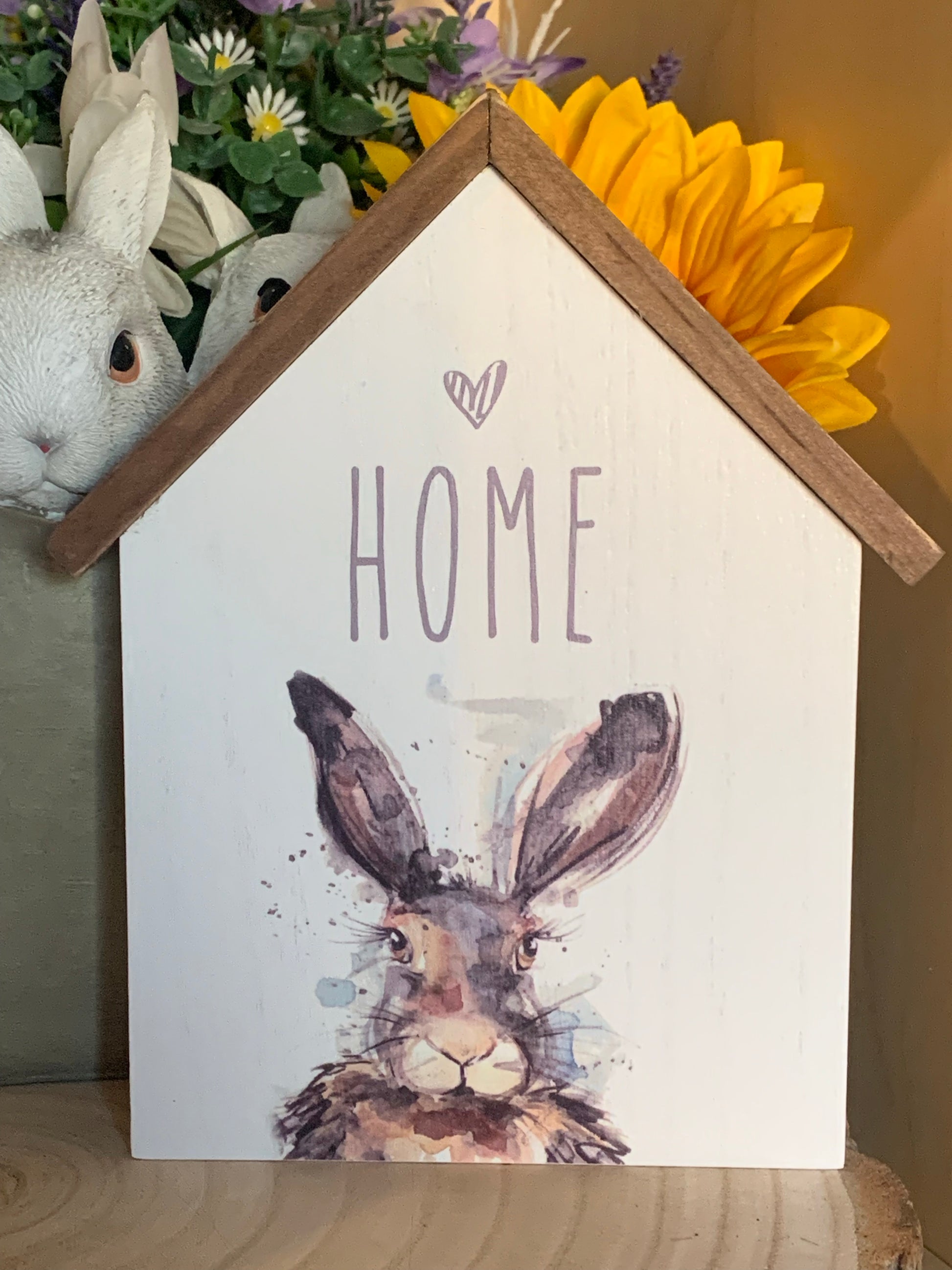 Spring Hare! Isn't he gorgeous?! Set on a white wooden house shaped block completed with rustic roof this block can be stood on a shelf or has metal hangers on the back for wall mounting.