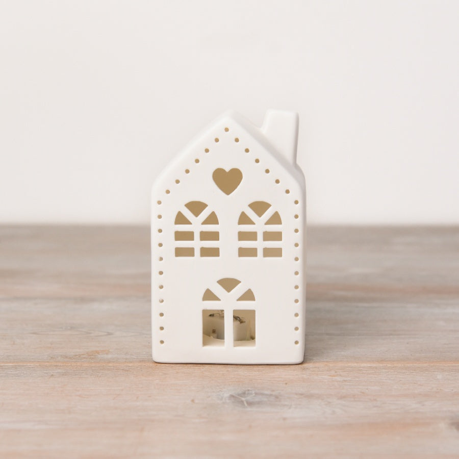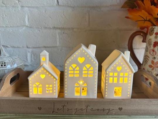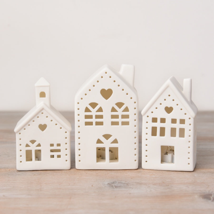 Set of white ceramic houses & church decorations featuring a light up design with cut out details including hearts & dots.