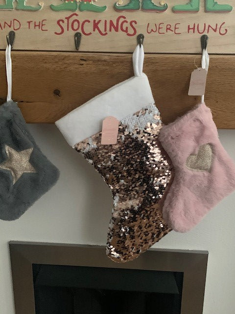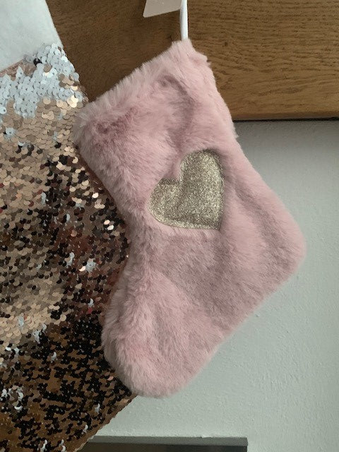 This plush pink stocking is perfect for adding some glamourous festive touches to the home. The stocking features a champagne gold glitter heart on the pink and star on the grey for a touch of sparkle.