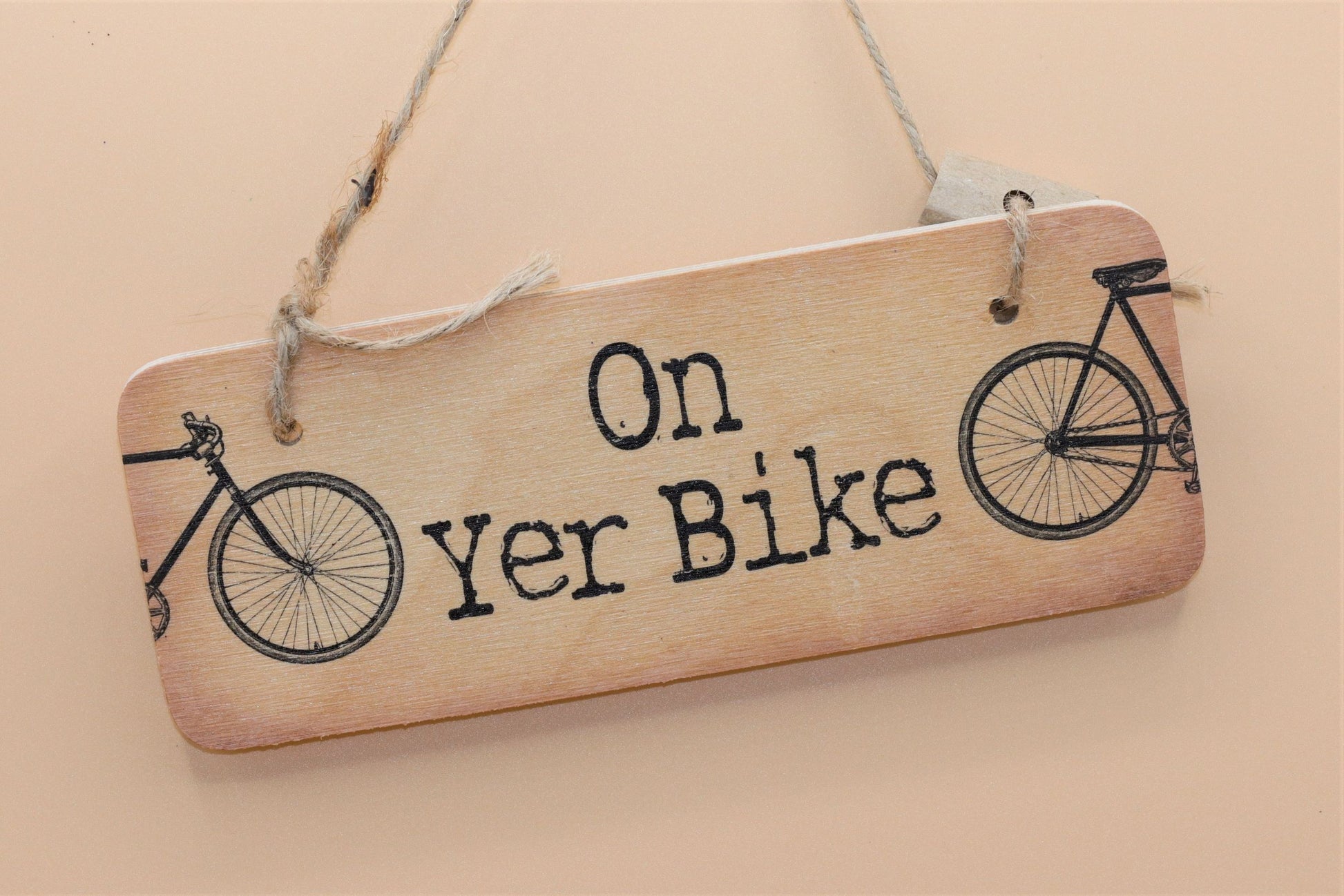 Beautifully handmade wooden sign with the slogan 'On Yer Bike'. The cyclist in your family will love this!