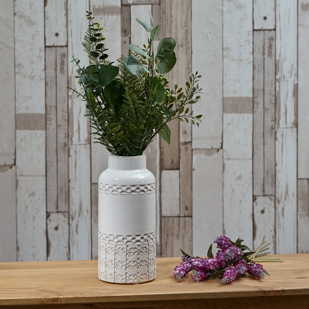 Beautiful vase with a classic embossed flower design, will sit on display as it is or pop your favourite blooms inside!
