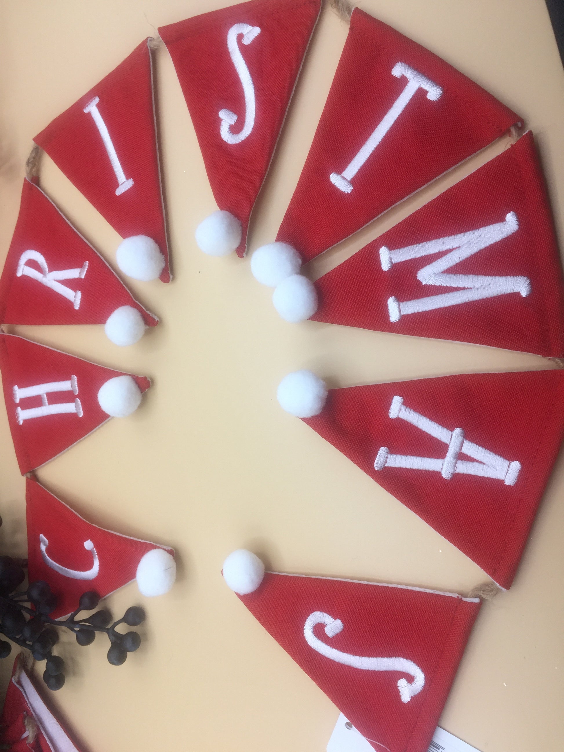 Each mini triangle is made from red fabric and has a cute little white pom pom on the tip, just like a little santa hat! A gorgeous decoration for the Christmas season.