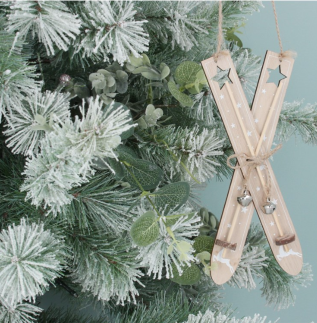 Cute natural wood skis with stars hanging tree decoration, these are the perfect addition to any white winter wonderland themed Christmas tree