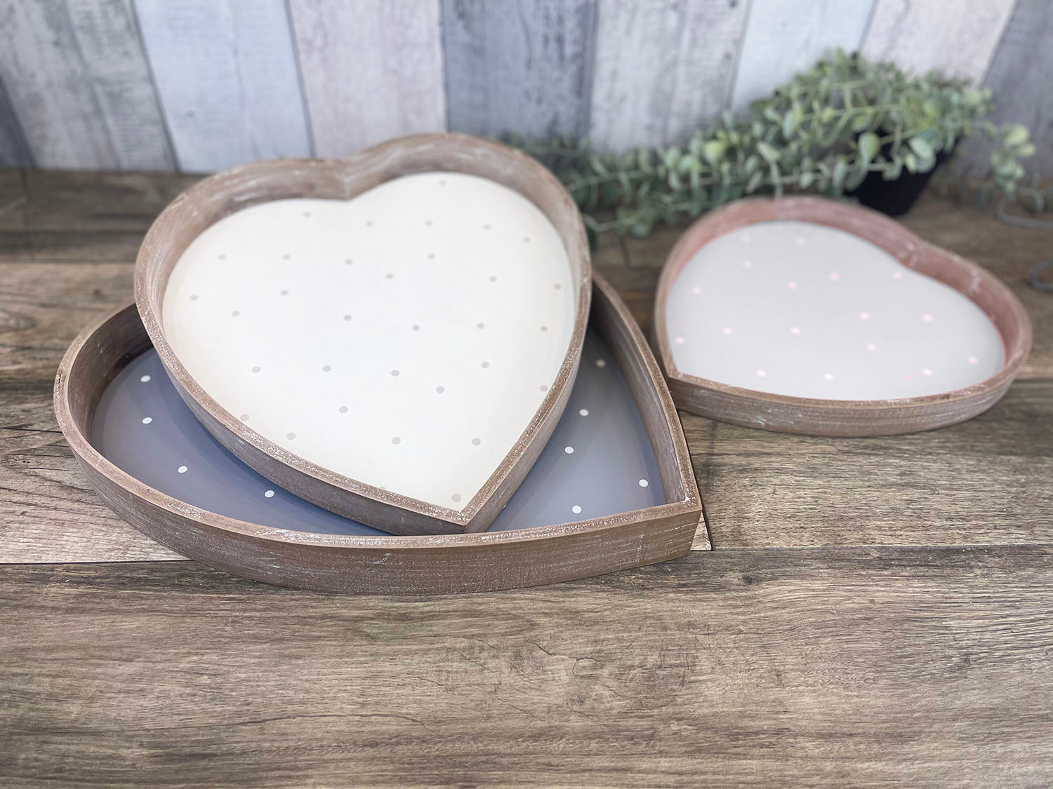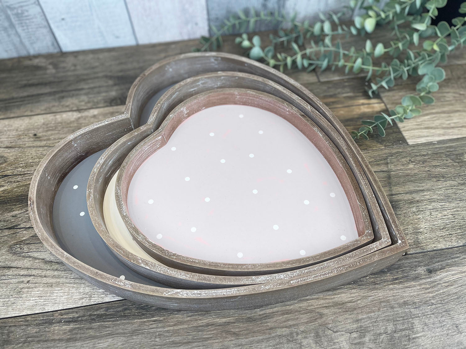 Set of 3 beautifully rustic wooden heart shaped trays in 3 pastel shades, they will sit neatly away inside each other when not in use.