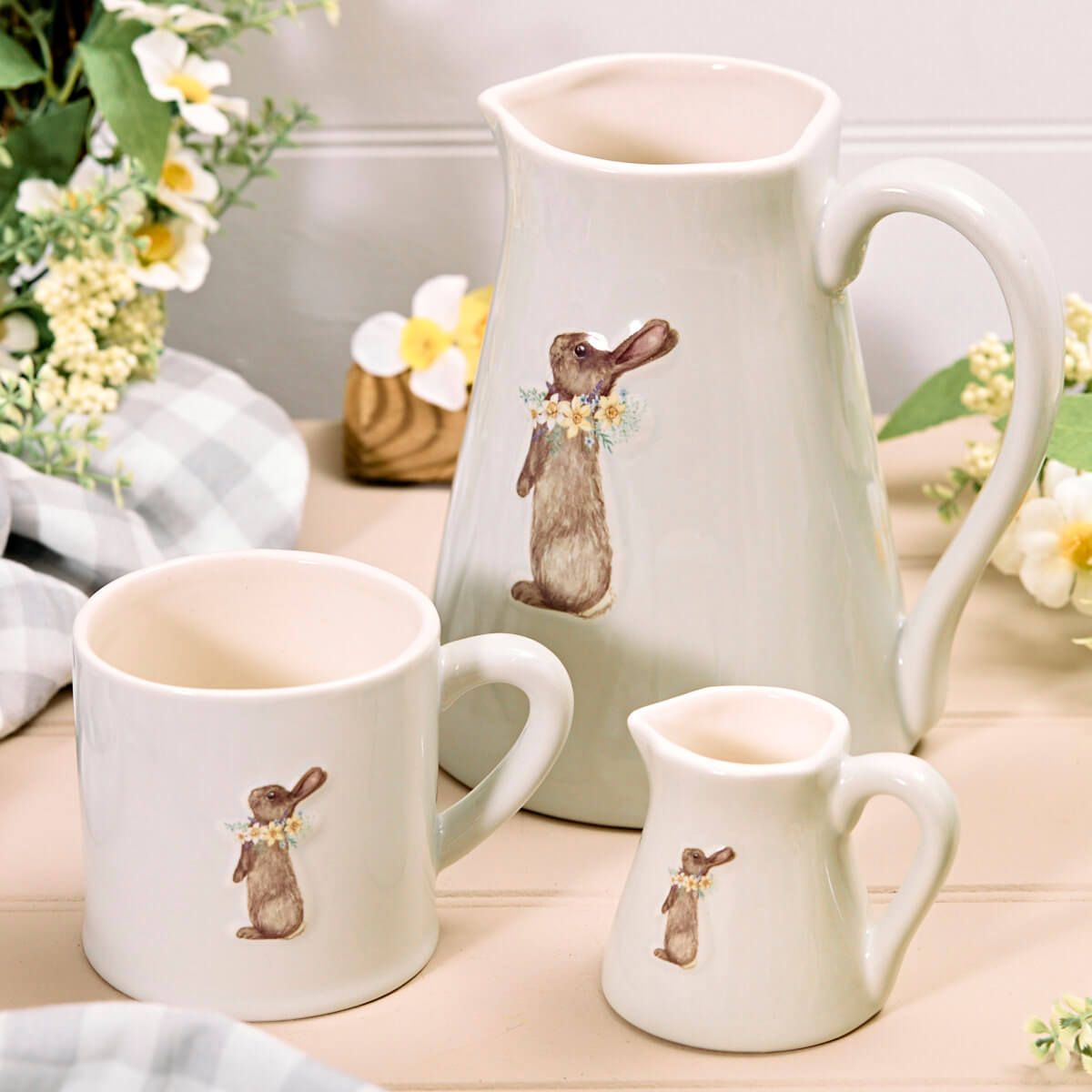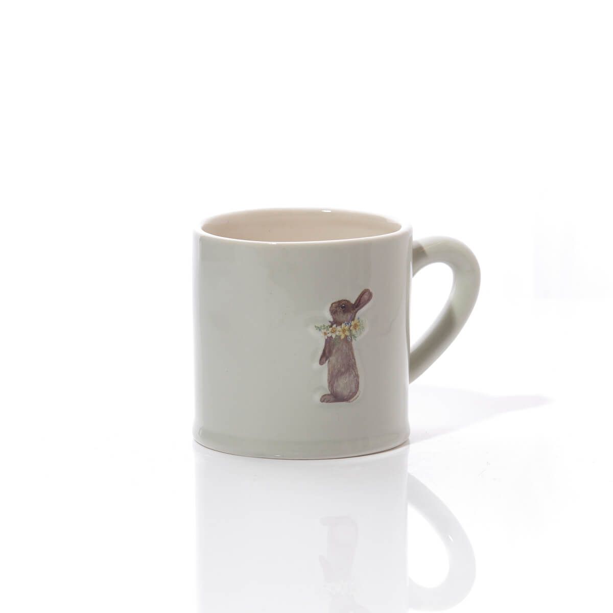 Stoneware mug in a light neutral color featuring an embossed rabbit design with flowers around its neck and a smoothly curved handle.