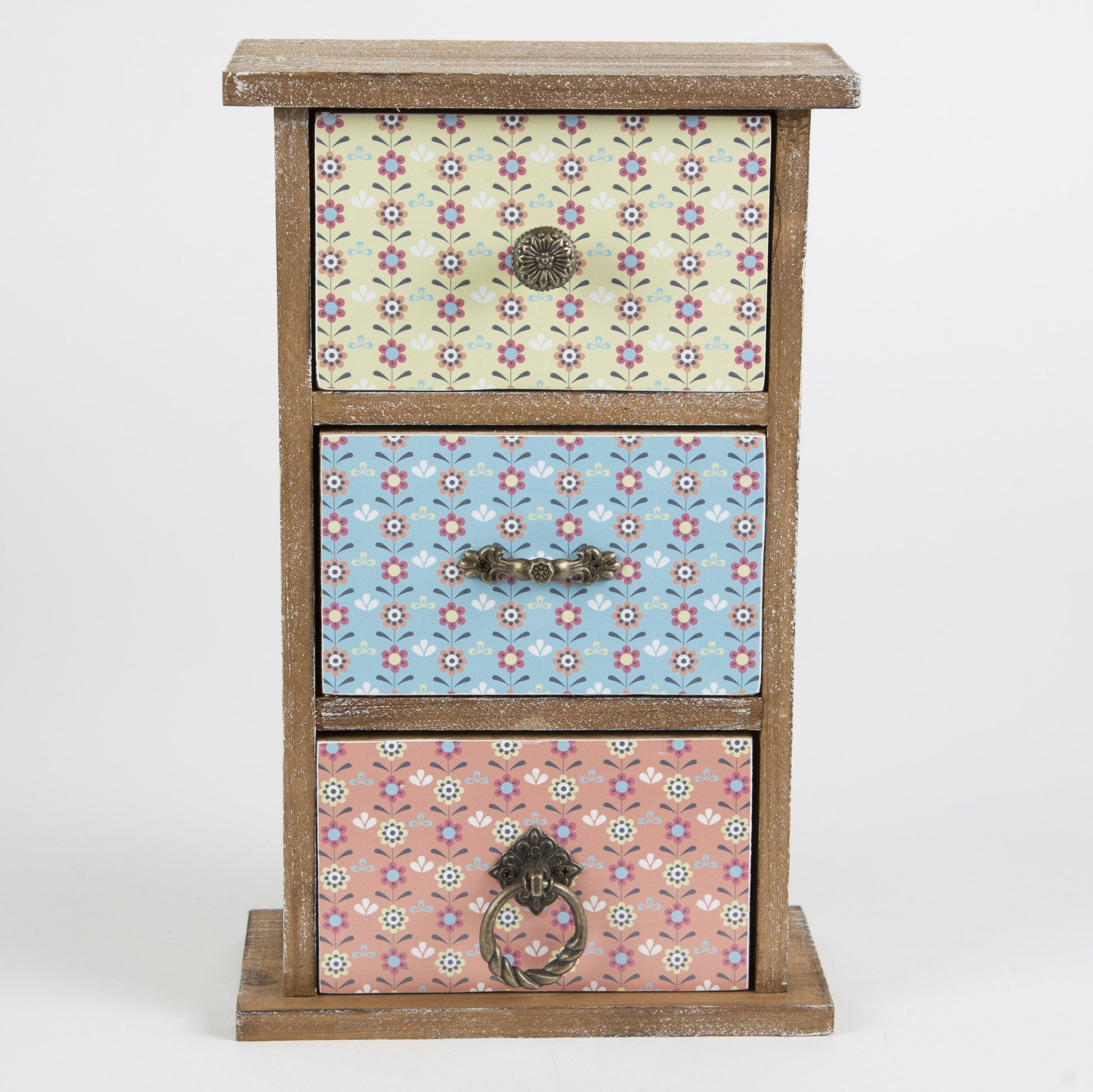 Add some style to the home with this small three drawer chest from the Summer Retro Daisy collection. Made from paulownia wood, it had a rustic finish and features the retro daisy print in three colourways with one on each drawer. Perfect for storing jewellery or any number of small bits and bobs. A lovely product with intricate detailing.