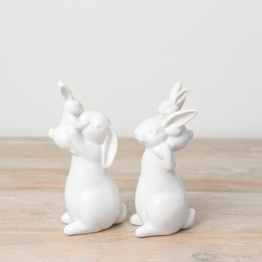We have two cute styles available featuring a small and large bunny embracing and kissing or a bunny riding on the shoulders of the other.