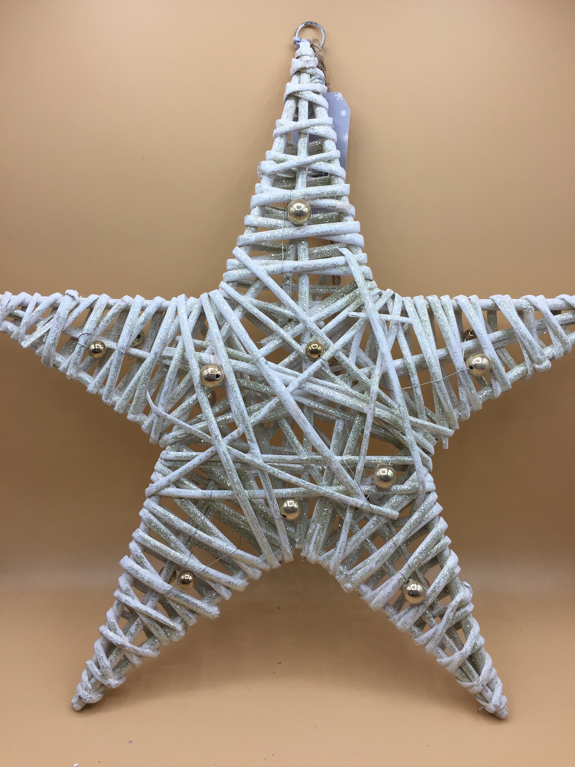 Rustic finished white star decorated with gold glitter and mini gold baubles.